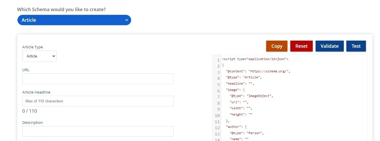 RankRanger Schema Markup Generator, created by the Similarweb agency, is a part of their comprehensive SEO software. This tool provides a wide variety of schema types to choose from, as well as the option to validate and test your schema markup with Google's Rich Results Test.