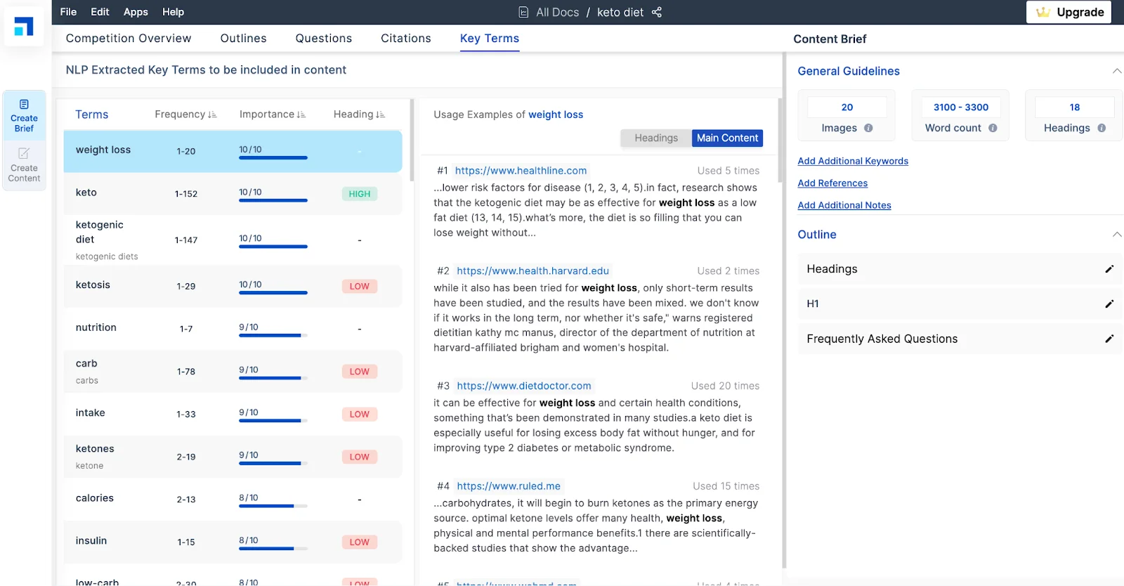 This tool helps provide insight into top-ranking URLs by scouring the search engine for your targetted keywords. These insights cover competition overview, important citations, NLP key terms to use, and more that help cut down on research time.