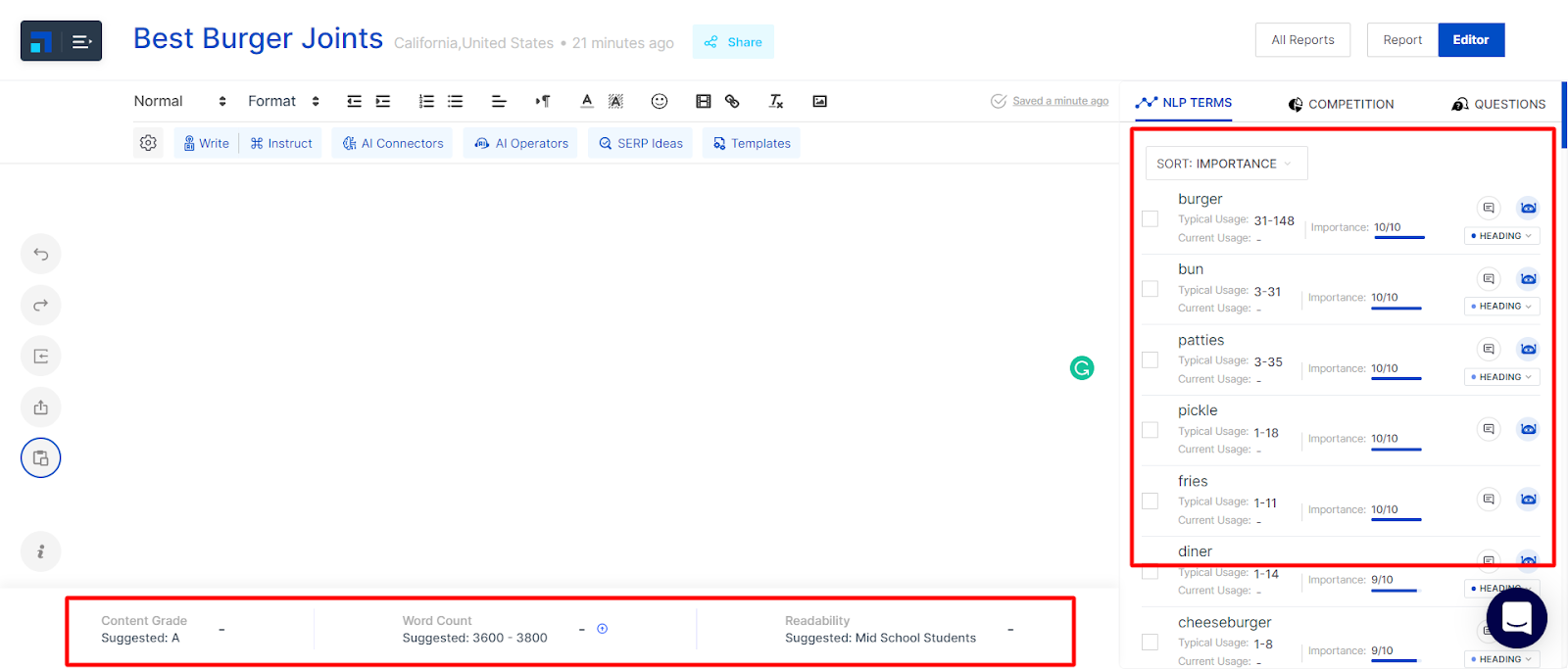 Using a local SEO intelligence tool like Scalenut will help you target the right keywords for your local content. For example, if you want to rank for a keyword like 'Best Burger Joints in California.’