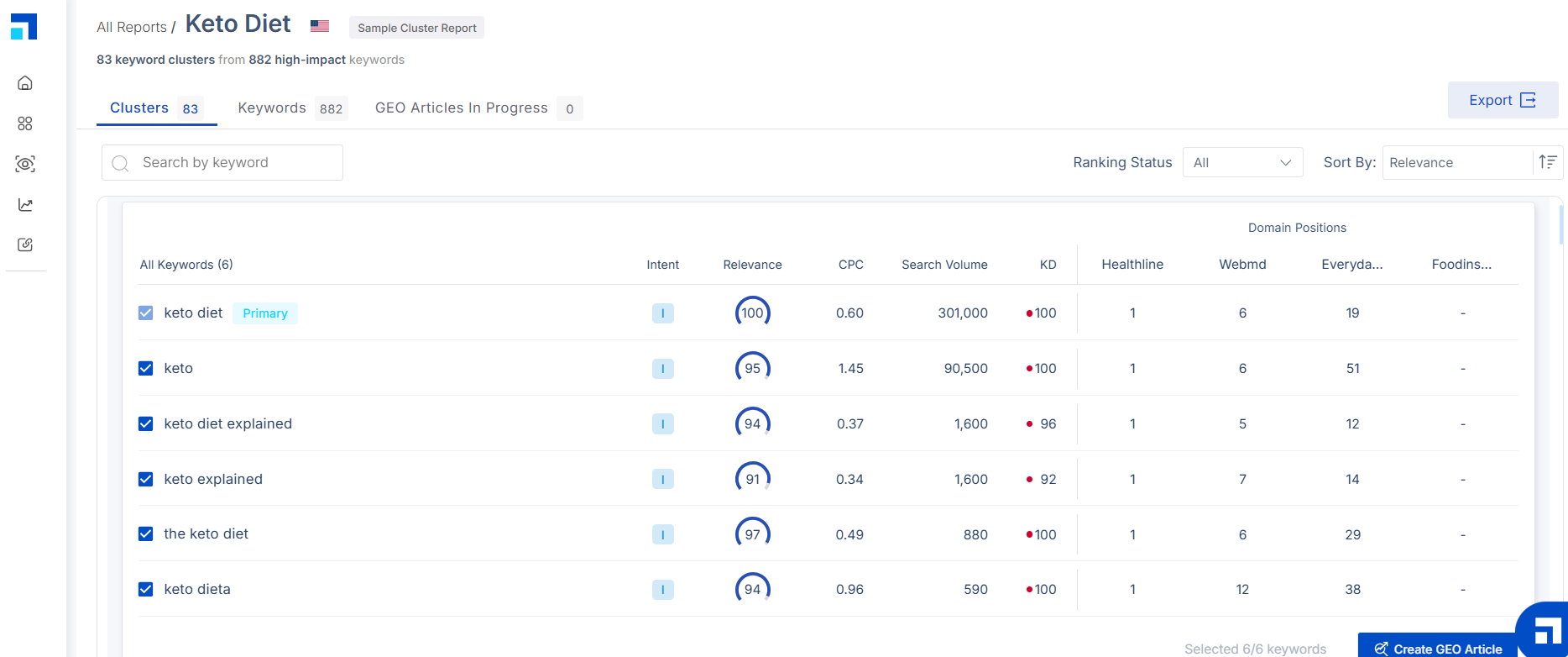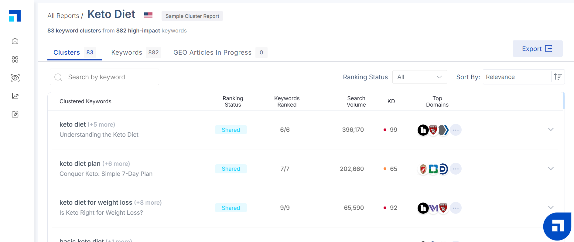 Instead of using thousands of keywords, the keyword planner groups them into meaningful topics and subtopics. This makes it easier to build authority-driven content clusters that work for both SEO and GEO.