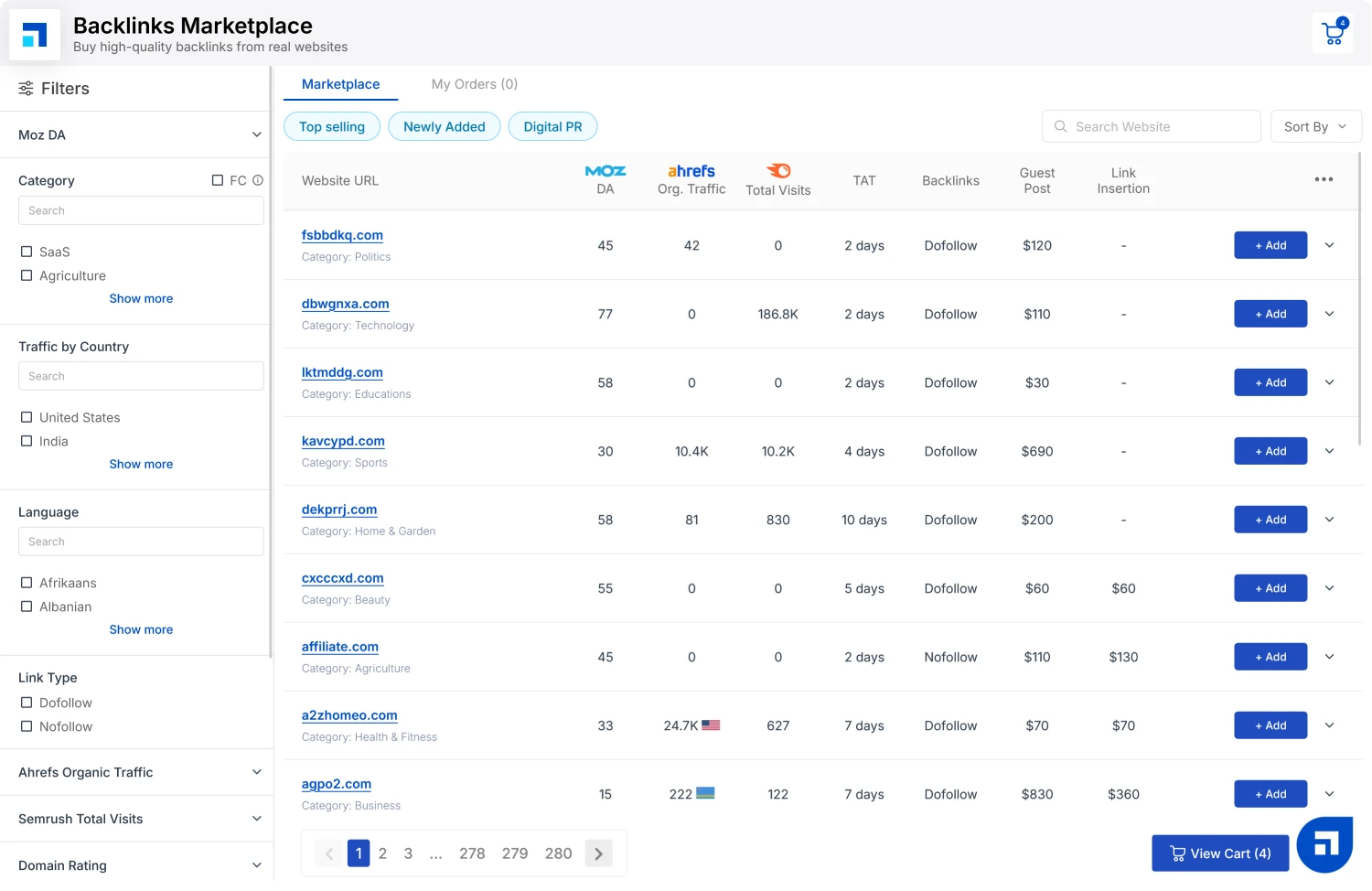 Use smart filters to search by niche, domain authority, traffic, region, language, price, and more. You can also sort by top-selling or newly added sites.