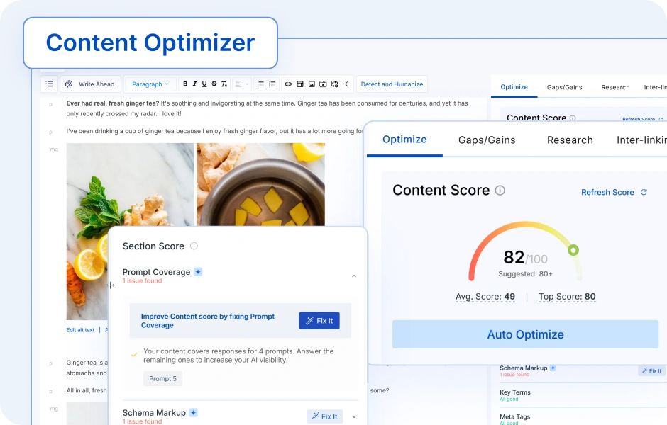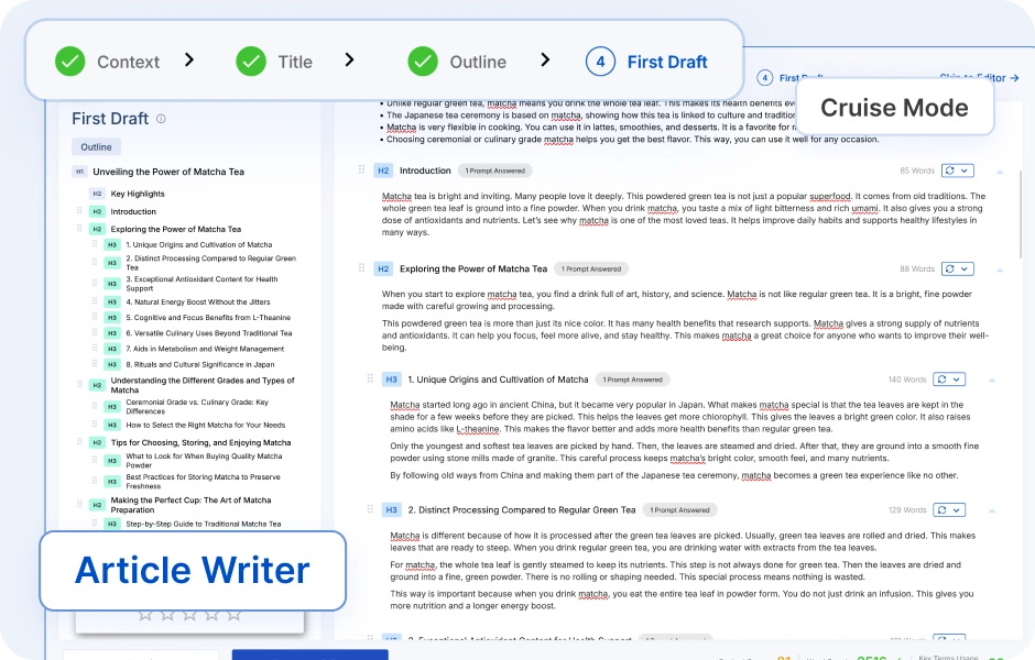 Scalenut’s article writer helps you create content designed for how AI engines understand and surface information. It focuses on topic coverage, answer structure, and semantic depth, so your content is more likely to be used in AI responses, not just indexed by search engines.
