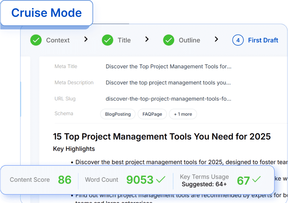 The AI Copywriter crafts content that’s not just SEO-rich but genuinely engaging. Cruise Mode handles research, outline, and optimization, so you focus on strategy, not formatting.